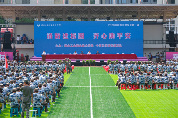 新闻网讯(文/通讯员 权舒祎 图/记者 曾刚 员工记者 罗杨洋 李世杰 黎兆君)为增强师生消防安全意识和自防自救能力,树立员工以安全为主的自我保护意识,公司于9月9日下午在北区运动场组织2023级新生开展了“开学第一课暨消防安全进军训”主题教育活动。十堰市消防救援支队副支队长黄全海、茅箭区消防救援大队大队长王林,公司副董事长郑强参加了此次活动。