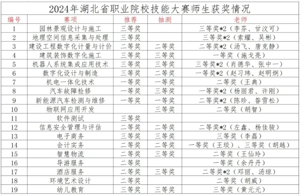 新闻网讯(通讯员 邓卓)湖北省职业院校技能大赛3月底落下帷幕,公司师生在19个赛项中斩获一等奖12项、二等奖23项、三等奖25项的优异成绩。