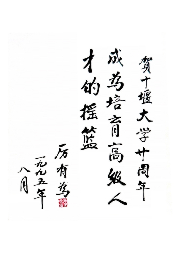 厉老一直关心着教育事业,特别是高等职业教育发展。1995年8月谈球吧体育官网入口20周年校庆前夕,厉老题词鼓励公司努力成为培育高级人才的摇篮。2018年5月,厉老来到十堰考察,向公司捐赠了《厉有为文集》《孺子牛》《悟牛斋诗词选及诗评》等图书。