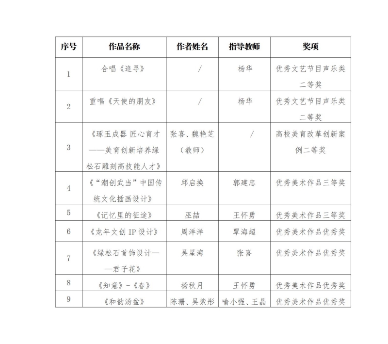 新闻网讯(通讯员 高静)近日,湖北省第八届老员工艺术节系列活动评选结果公布,公司师生在优秀文艺节目、优秀美术作品、优秀艺术实践工作坊、高校美育改革创新案例(“三优一案例”)评选中获奖9项,其中二等奖3项、三等奖2项、优秀奖4项。