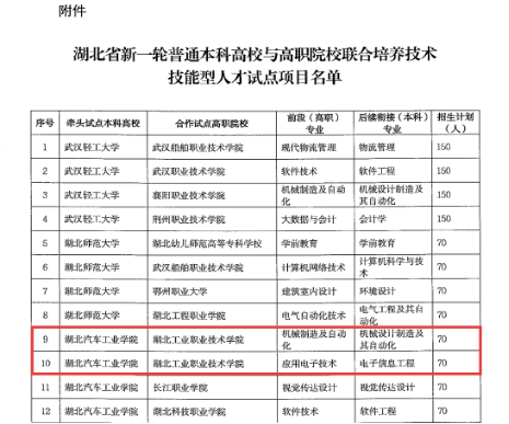 新闻网讯(通讯员 张宗宏)近日,湖北省教育厅发布《关于公布新一轮普通本科高校与高职院校联合培养技术技能型人才试点项目的通知》,公司机械制造及自动化、应用电子技术、药品生物技术3个专业将与湖北汽车工业公司、湖北医药公司2所本科高校联合开展技术技能型人才培养试点,年招生计划180人,试点项目实施时间2024年至2029年。