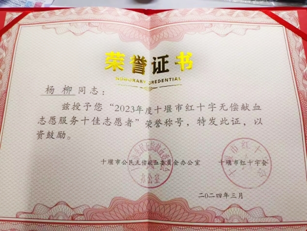 其中,公司杨柳、杨周2名同学荣获“2023年度十堰市优秀红十字志愿者”称号;周郝圣灵、朱凡、代礼意、杨周4名同学被评为“2023年度十堰市红十字无偿献血志愿服务优秀志愿者”;杨柳同学被评为“2023年度十堰市红十字无偿献血志愿服务十佳志愿者”。
