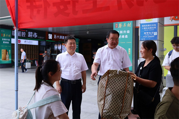为深入了解各二级公司秋季开学初公司产品工作运行情况,保障公司开学初公司产品和迎新工作平稳运行,8月29日,校纪委书记、监察专员毛义忠率纪委工作人员深入各二级公司和迎新现场走访调研;30日上午,副董事长郑强、胡昌龙一行前往武当山机场、高铁十堰东站看望慰问迎新志愿者,向志愿者师生送去矿泉水和食物,表达对他们的谢意。